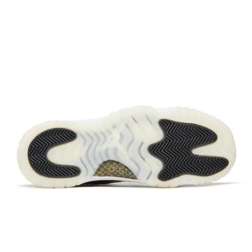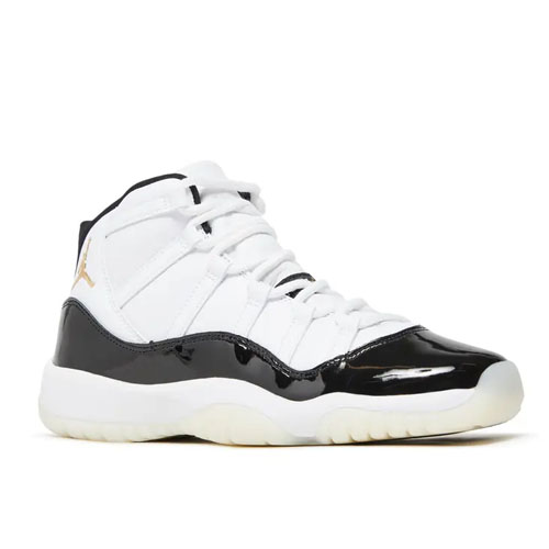 Designed for older kids and featuring colorblocking that evokes the 'Concord' colorway of the AJ11 silhouette, the Air Jordan 11 Retro GS 'Gratitude / Defining Moments' presents a striking black mudguard in glossy patent leather against a white leather upper with matching webbing eyelets. Metallic gold accents appear via a stylish '23' on the back tab and a gleaming Jumpman logo on the side collar. The sneaker is supported by a white Phylon midsole which rests on a semi-translucent rubber outsole with a creamy tint.
